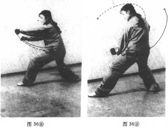 (5) 右臂向前平划至体前后,重心后坐成半马步,同时 双臂向内沉肩,坠肘回收,力达前臂,双臂微屈,目视左下。 (图36⑧、⑨)