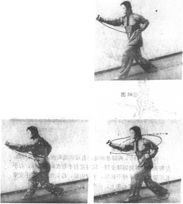 (2) 左脚向后退步,右臂 屈肘收拳于腰间,拳眼朝上;左 拳同时由腰间向前冲出,拳眼 朝上,高与肩平。(图38②)