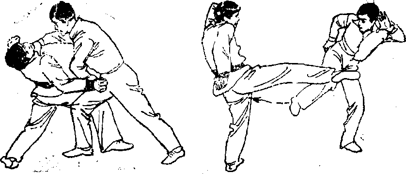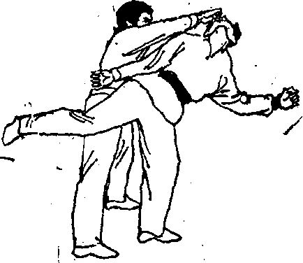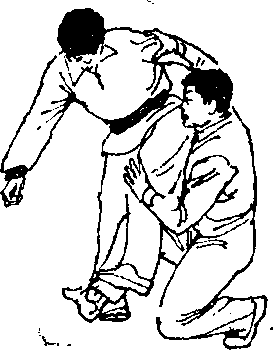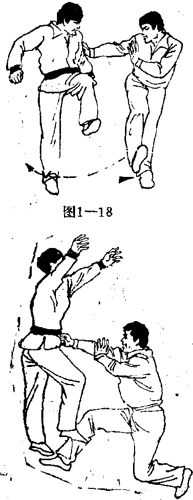 他稍懈或注意力被引开之时,突然跃上前去,以手控制其 手臂,下面用左勾踢腿铲击对方前脚(图1T8) 0若对方被 铲中,必然会失重倒地3若对方提膝让过我之勾踢,我就可 顺他提脚之势逼近其身体,同时迅速下蹲,左脚尖外摆别住 他的右脚跟,左手按住他的左膝,右手仍按住他的肩部(图 1-19),两手随身体前倾猛地一推,彼必后倒(图120)