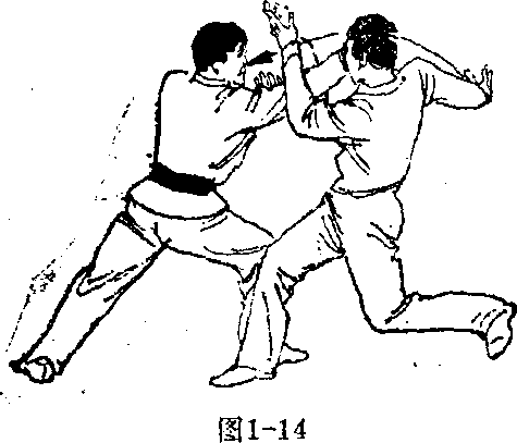 度,径直攻击其虚处。与“你打你的,我打我的“见解颇有 异曲同工之妙。这一派的独到之处,是在“防”字上别有 一番匠心,即“防”不在格架中,乃在“角度”二字上。好 似根本不防,却是防在“避”中,以避代防,在避、攻一体 中实现的硬攻直上(如图1?18至图1-20所示)0