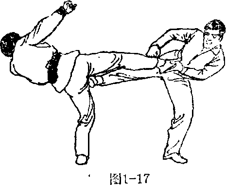 若对方起胭侧踢我小腹,我可顺他腿的起势,以我之右 膝由下往上与其小腿成交叉(图116),然后再顺其腿之下 方踹击他的裆部