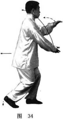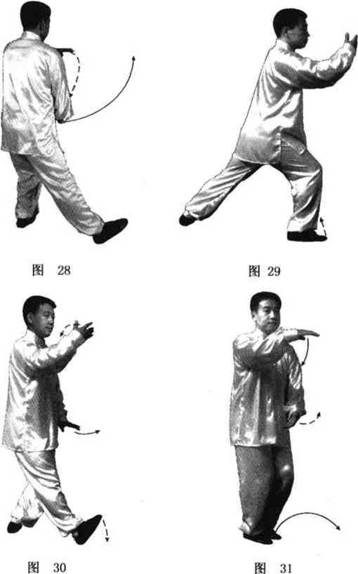 步;同时上体右转,左右手随转体分别慢慢向左下右上分开,右 手高与眼平(手心斜向上),肘微屈:左手落在左胯旁,肘微屈, 手心向下,指尖向前;眼看右手(图28、29)。
