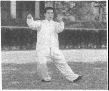 弧形状,不可伸直。完成姿势上身正直,松腰;左肘与左膝上下 相对,两肩下沉。弓步为顺弓步,两脚横向间约一平拳距离 (10cm),胸中线对左前方45°方向。动势,左手向夕卜翻掌向前推 时,要随转体边翻边推出,不要翻掌太快或最后突然翻掌。全部 过渡动作,上下要协调一致。