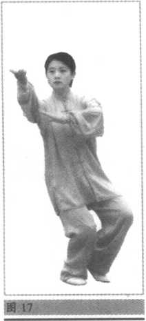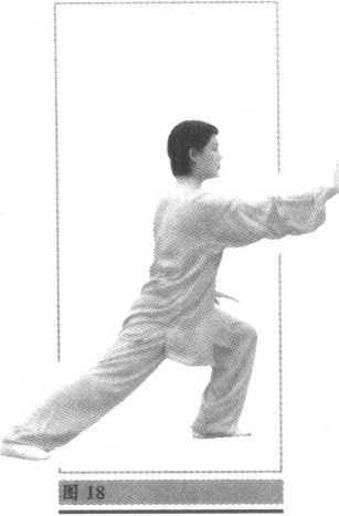② 上体左转,左脚向前(偏左)迈出变成左弓步;同时右手收回由耳 侧向前推出,高与鼻平。左手向下由左膝前搂过落于左胯旁,指尖朝 前。目视右手手指(图16~18)o