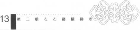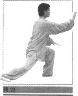 ③ 右腿慢慢屈膝,上体后坐,身体重心移至右腿,在脚尖跷起微朝 外撇,随后脚掌慢慢踏实,左腿前弓,身体左转,身体重心移至左腿,右