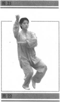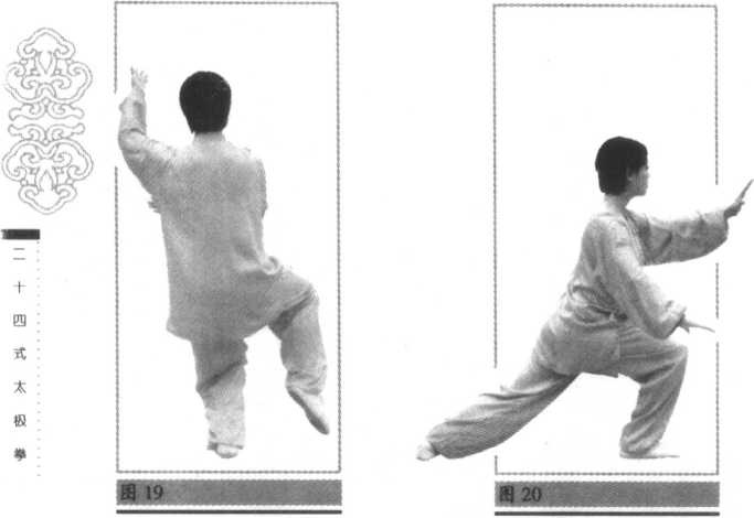 脚收至左脚内侧,脚尖点地;同时左手向外翻掌由左手向上划弧至左肩外 侧,肘微屈,手与耳同高,手心斜朝上;右手随转体向上、向左下划弧落于 左腹前,手心斜朝下。目视左手(图19、20)。
