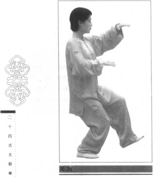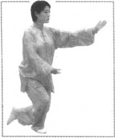 要点:前手推出时,身体不 可前俯后仰,要松腰松胯。推掌 时要沉肩垂肘,坐腕舒掌,同时 须与松腰、弓腿上下外调一 致。搂膝拗步变成弓步时,两脚 跟的横向距离约保持30厘 米。