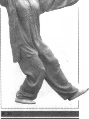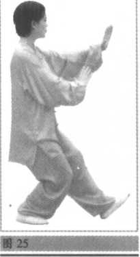 右脚跟进半步,上体后坐,身体重 心转至右腿上,上体半面向右转,左脚 略提起稍向削移,变成左虚步,脚跟着 地,脚尖跷起,膝部微屈,同时左手由左 下向上挑举,高与鼻平,掌心朝右,臂微 屈;右手收回放至左肘内伽,掌心朝左; 目视左手食指(图24、25)。要点:身体要平稳自然,沉肩垂肘,阙部放松。左手上起时不 要垂直上挑,要由左向上、向前,微带弧形。右脚跟进时,脚掌先着 地,再全脚踏实。身体重心后移和左手上起、右手回收要协调一 致。十四a太极