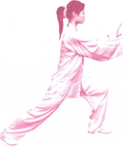 ⑤ 前弓时左膝超过脚尖,这叫过劲。产生原因:主观上以为 这样动作就做充分了,但这要造成转换不灵。糾正方法:膝关节 可略向前越出小腿的垂直线,但以不超过脚尖为限。