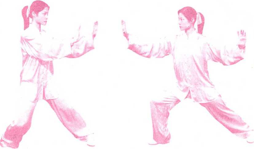 ③ 两手收回时凸胸,两肩紧张内收。产生原因:对凸胸和含 胸分不清,含胸是要胸部有宽舒的感觉,以利于呼吸,是两肩微 向前合;凹胸是紧张内收,这不利于两手的化动。糾正方法:肩 关节要放松,两肩微向前含,胸部宽畅,但也不能挺胸。