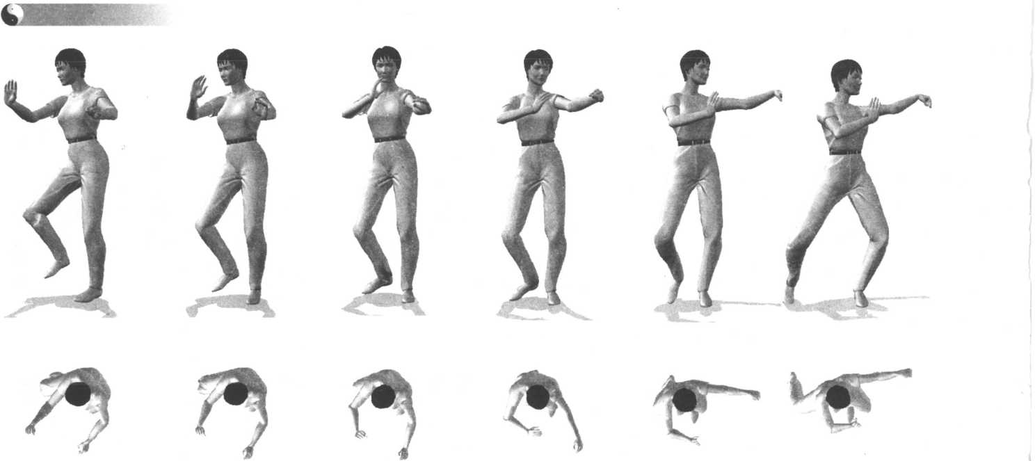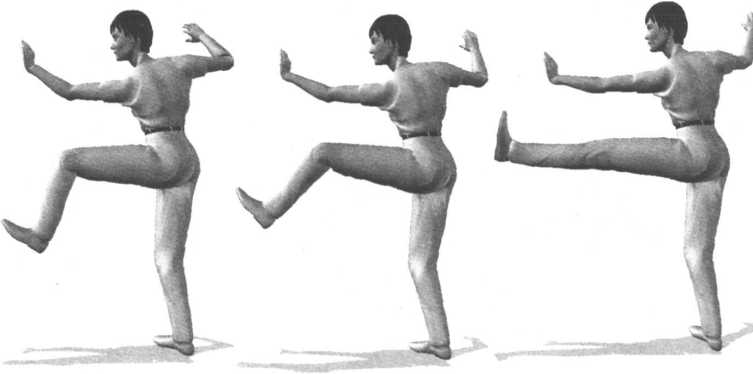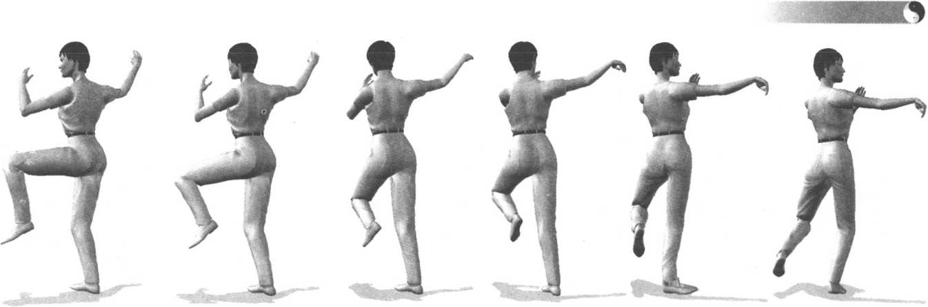 6 .同时左臂继续向前伸出(立掌)。眼看左手。右腿慢慢提起平屈(成独立式),同时右勾手下落变成掌, 并由后半部下方顺右腿外侧向前摆出。