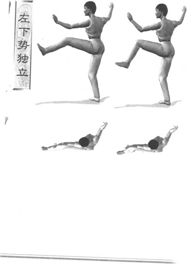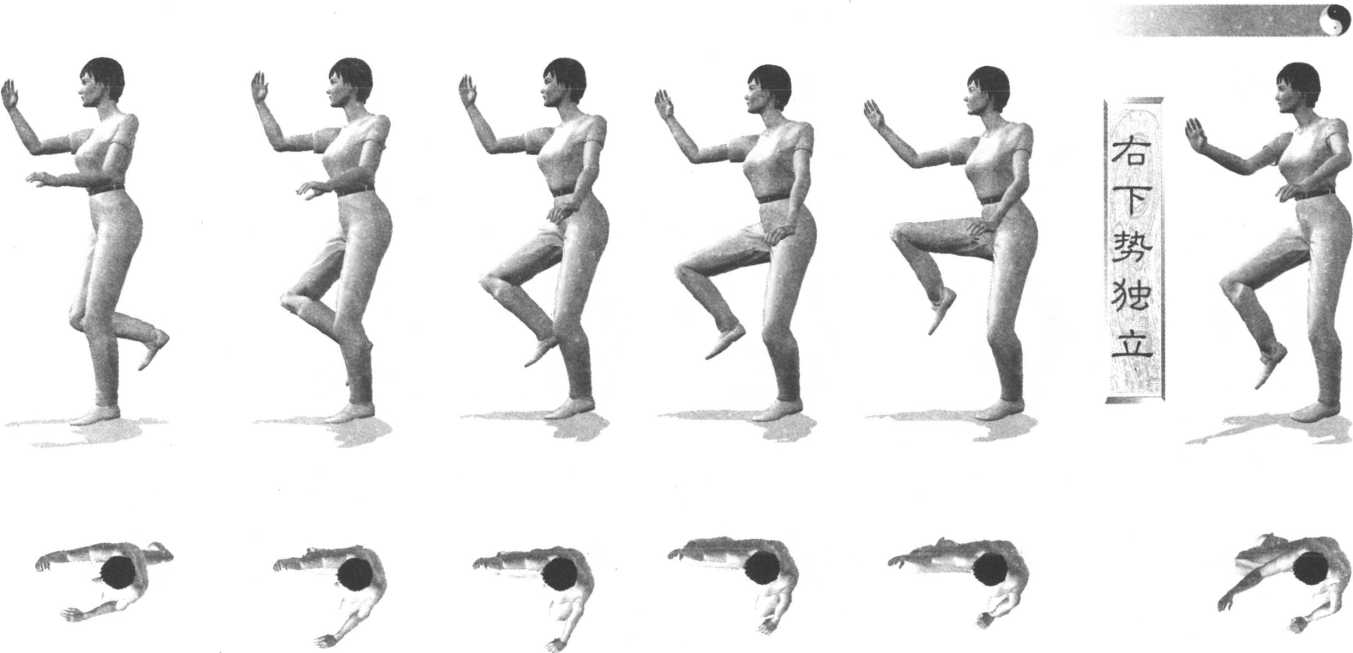 7 .右臂屈肘立于右腿上方,肘与膝相对,手心向左;左手落于左胯旁,手心向下。眼看右手。 要点:上体正直,独立的腿微屈,右腿提起时脚尖自然下垂。