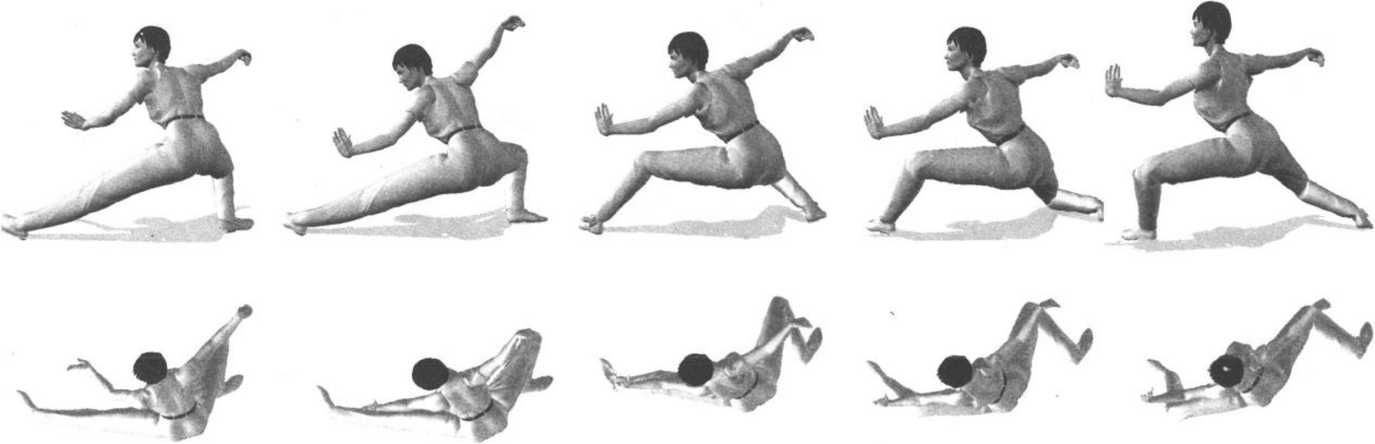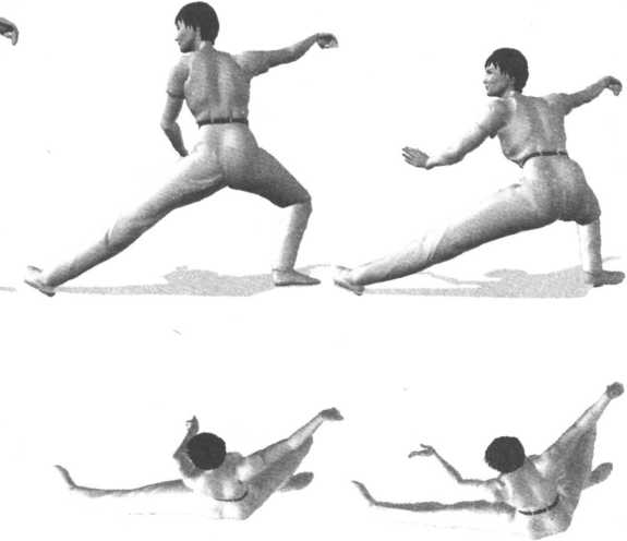 3 .右腿慢慢屈膝下蹲,左腿向左侧(偏后)伸出,成左仆步。