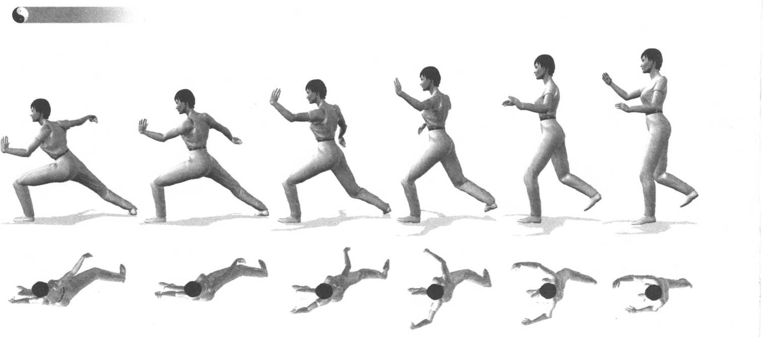 5以左脚跟为轴,脚尖向外扭直(略外撇),随着右腿后蹬,左腿前弓,右脚尖里扣,上体微向左转并向 前起身。