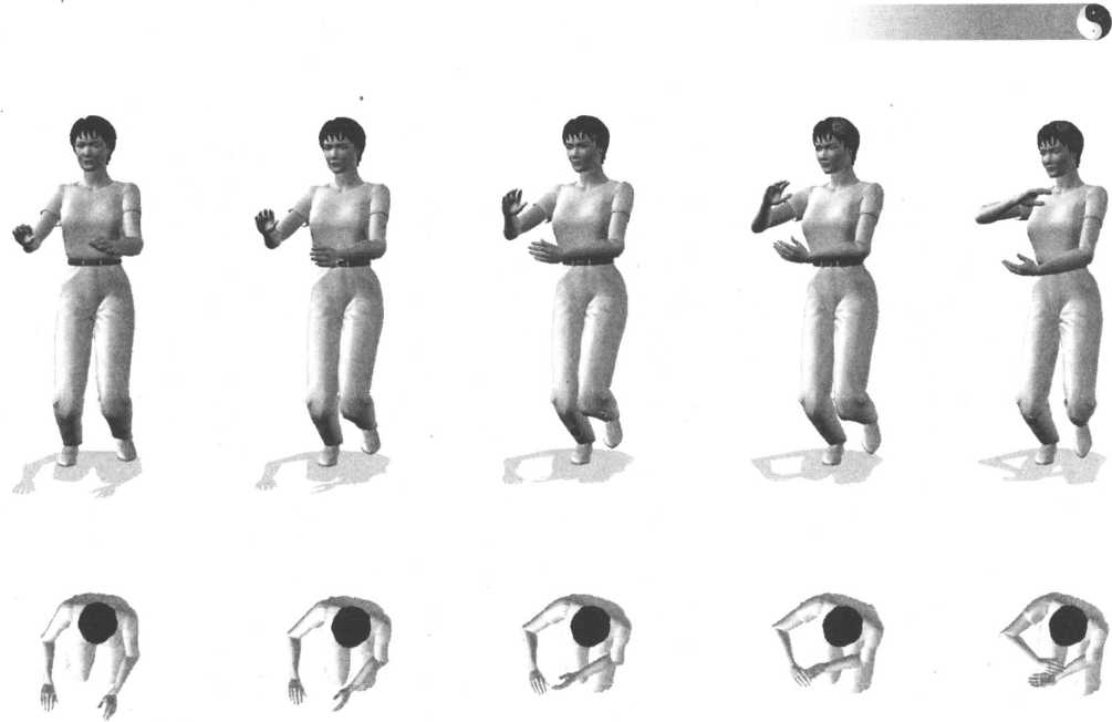 1 .身体自然直立,与肩同宽。两臂自然下垂,两手放在大腿外侧。眼向前看,头须正直,下颌微向后收, 不要故意挺胸收腹,精神要集中。2 .两臂慢慢向前平举,两手高与肩平,手心向下。3 .上体保持正直,两腿屈膝下蹲,同时两掌轻轻下按,两肘下垂与两膝相对。眼看前方。两肩下沉,两肘 松垂,手指自然微曲,重心落于两腿中间。屈膝松腰,臀部不可突出。一左右野马分鬃一一左右野马分鬃一