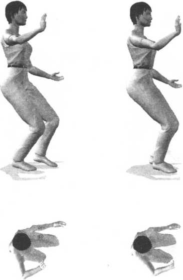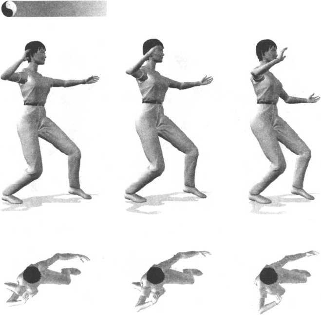 3 .左手回收经左肋外侧向后上划弧平举,手心向上;右手随之再翻掌向上。同时左腿轻轻提起向左后 侧方退一步,脚尖先着地,然后慢慢踏实,重心在左腿上,成右虚步。眼随着向左转体,先向左看,再 转看右手。