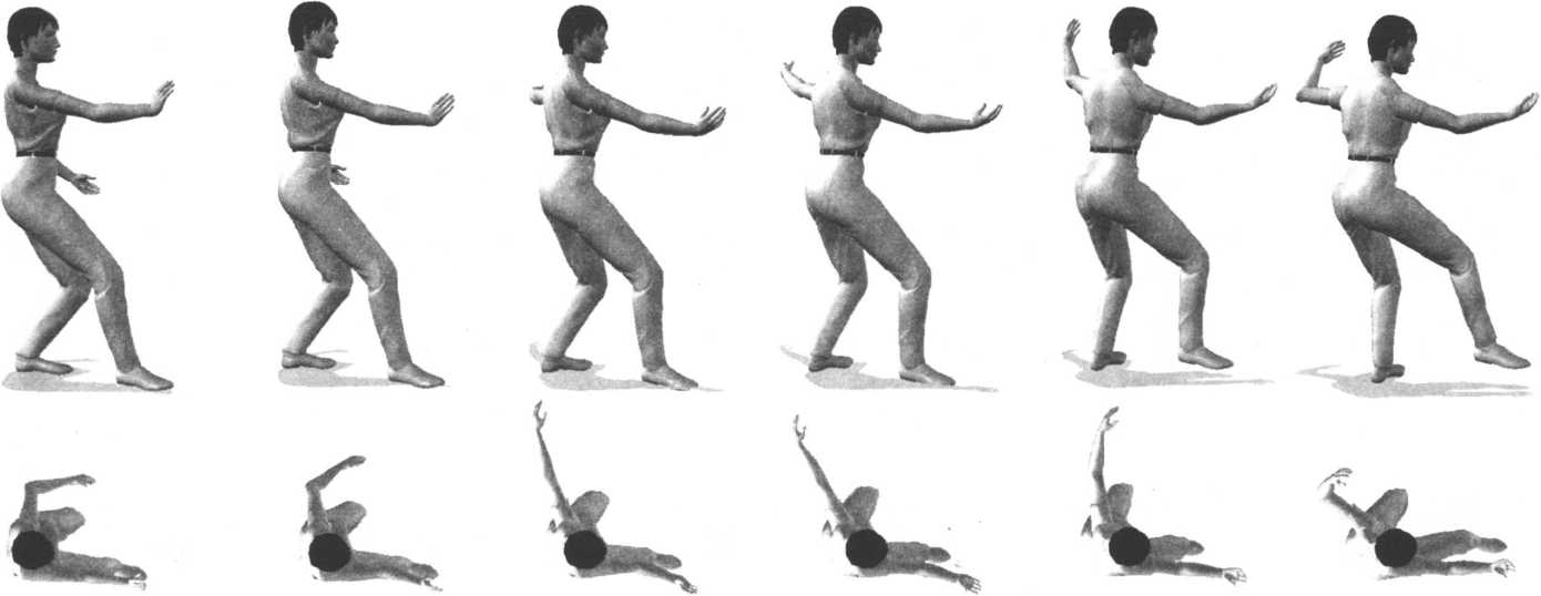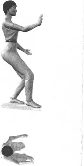 4 .右臂屈肘回收,左手由耳侧向前推出,手心向前;右手回收经右肋外侧向后上划弧平举,手心向上; 左手随之再翻掌向上。同时右腿轻轻提起向右后侧方退一步,脚尖先着地,然后慢慢踏实,重心在 右腿上,成左虚步。眼随着向右转体,先向右看,再转看左手。