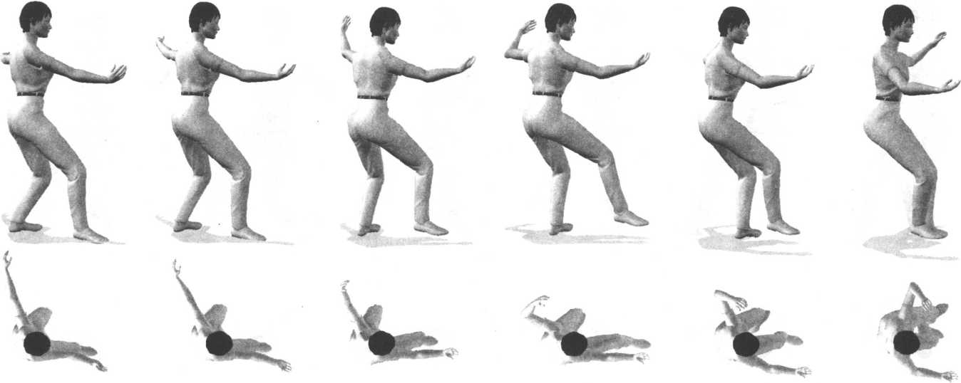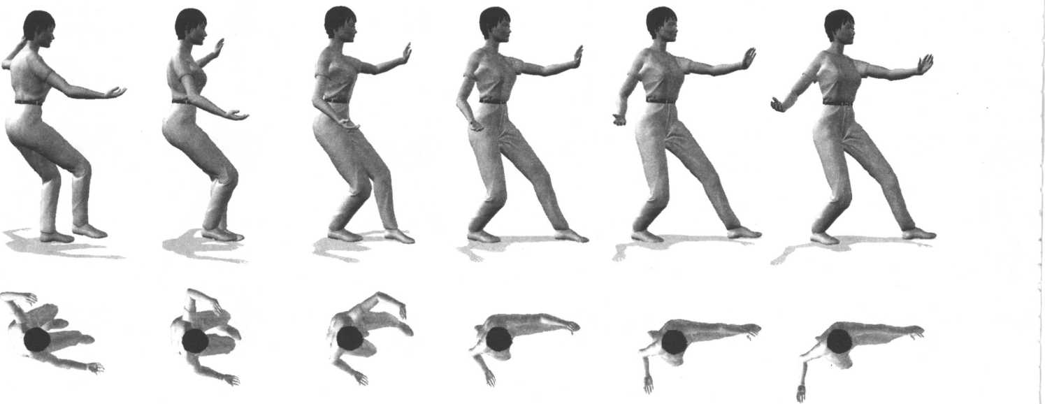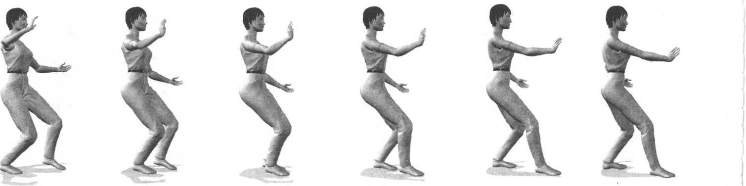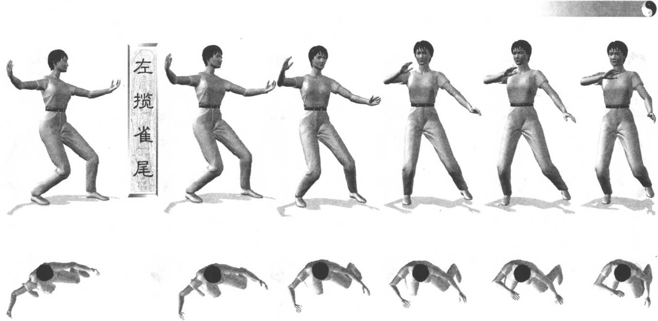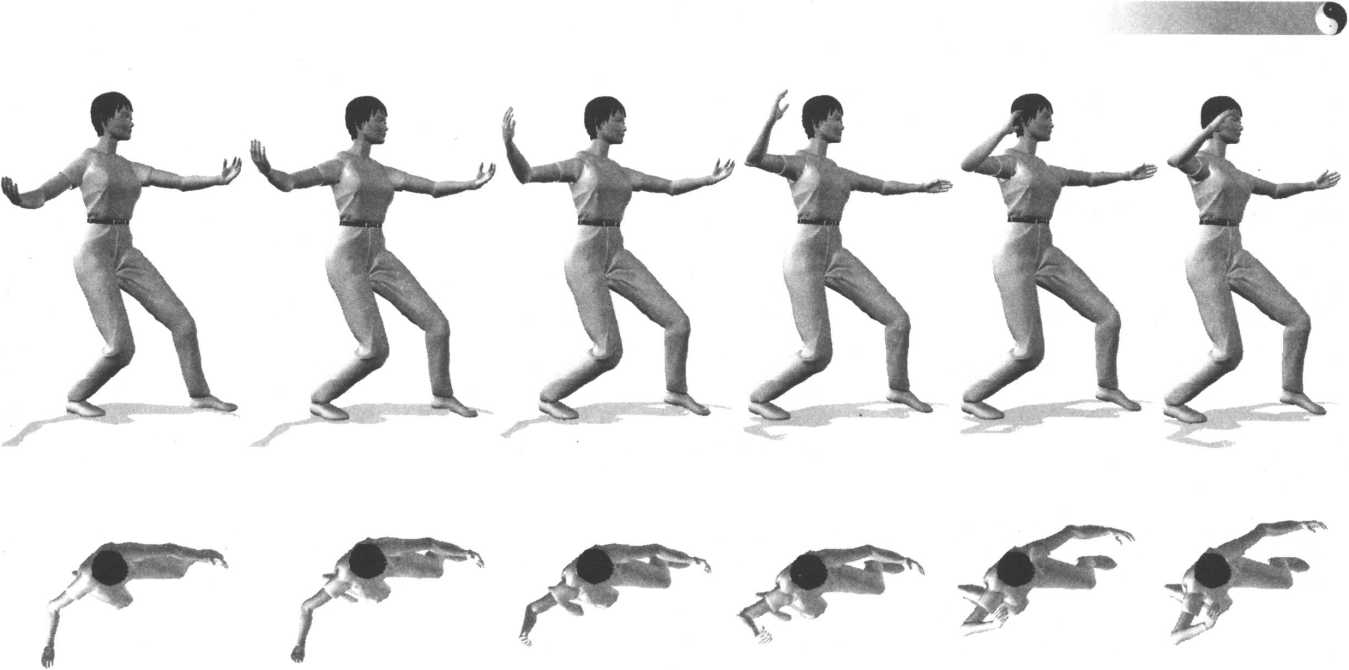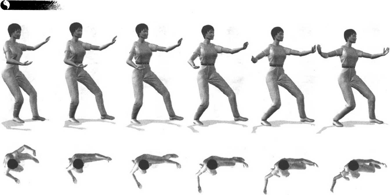 要点:前推的手不要伸直,后收的手也不可直线向回抽,仍走弧线。前推时,要转腰松胯,与两手的速 度要一致,避免僵硬。退步时,脚尖先着地,再慢慢踏实,同时把前脚扭正,退左脚略向左后斜, 退右脚略向右后斜,避免使两脚落在一条直线上。后退时,眼神随转体动作向左右看,然后再转 看前手。