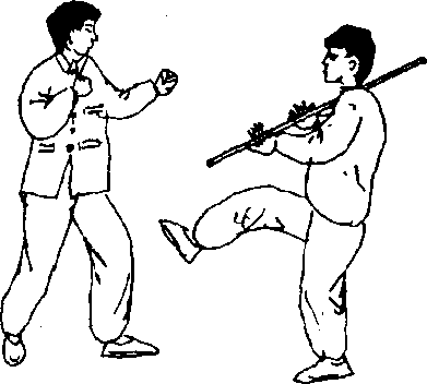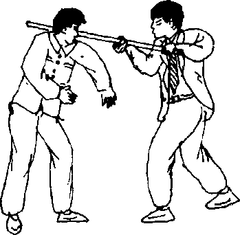 施暴情形:贼欲向我扑来; 我退于棍旁,右脚踩于棍上中间 (图 6 — 48) o图 6 — 48图 6 — 48图6 — 49图6 — 49图 6-50图 6-50抗暴顺序:我右脚向后一 搓,使棍跳起,脚尖向前一铲,使 棍被铲于脚面上,然后向上一 踢,将棍踢于空中,两手接抓在 手(图6 — 49)。动作不停,我用棍 向贼头部铲扫击(图6 — 50)。图 6 — 48图 6 — 48图6 — 49图6 — 49图 6-50图 6-50动作要点:搓、铲、踢动作要柔和连贯,接抓棍要及时、准 确;扫击贼头要快速、猛狠。