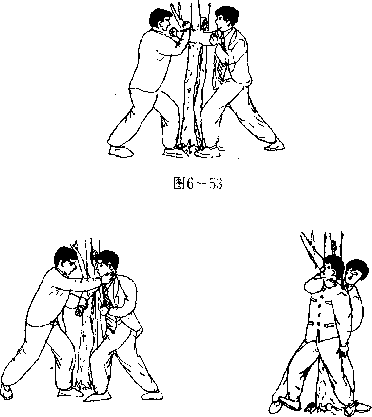 抗暴姿势:贼拦住我去路,我速躲于树旁;贼用右拳向我 面部打来;我用右臂向左格挡贼右臂于树干上(图6 — 53)。反击动作:我左手抓握住贼右腕向下、向外拧(图6- 队)。将贼右臂拧捆于树干上,并用右臂勒住贼喉紧靠于树干 上(图 6 — 55)。?210?动作要点:格臂防守要及时;横向用力,将贼臂压于树干 上;拧臂要快速,捆树干要紧,勒喉要有力。