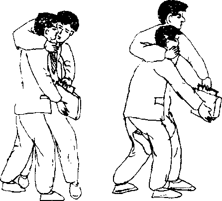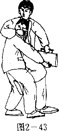 夺包情形;我左手提提包在 路上行走;贼由正面向我走来, 近身时,双手抓住包往下夺(图2 一40)。防夺顺序:我见贼双手下夺 我包,我右脚快上一步,身体左 后转,同时用右臂夹住贼颈(图2 — 41)。动作不停,我用右手扒住 贼下颌,向右后搬拦旋转其颌 (图2 — 42)。接上动作,我用右脚猛踩贼左膝部(图2 — 43)。图 2 二 41 图 2 —42动作要点:上步要快速;夹颈要牢紧;搬拉旋转其颌要快 猛;踩膝要准确、有力。
