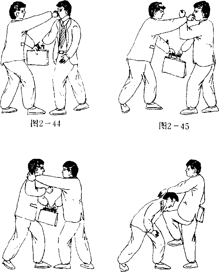 夺包情形:我右手提提包在路上行走;贼由我正面走来, 左手抓包下夺,并用右拳向我面部击打(图2 — 44)。图2 — 46图2 — 46图 2 —47图 2 —47图2 — 46图2 — 46图 2 —47图 2 —47防夺顺序:我右手抓包不放,向回猛拉,并用左臂向左上 架挡贼右拳(图2 — 45)。动作不停,我用左掌外缘猛砍贼颈右 侧(图2—46)。接上动作,我左手抓住贼后颈向前下搬,同时 用左膝撞击贼胸(图2 — 47)。动作要点:架防要及时;砍颈要快、猛;搬颈、撞膝要一致, 撞胸要快速、准确、有力。