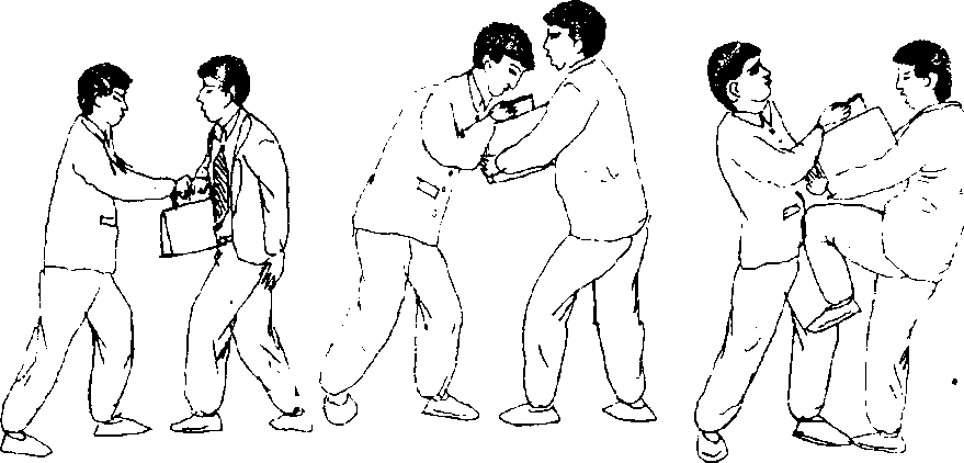 夺包情形:我右手提提包在路上彳丁走;贼由我正前走来. 近身时左手抓住提包下夺(图2 — 76)。‘防夺顺序:我两手速抱住提包向回拉(图2 — 77),同时提 左膝向贼裆部撞击(图2-78)。图 2 —76 图?一77 图 >78动作要点:双手抱包要牢,回拉有力;撞贼裆部要快速、猛 狠。