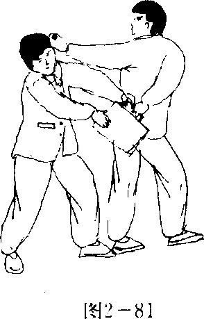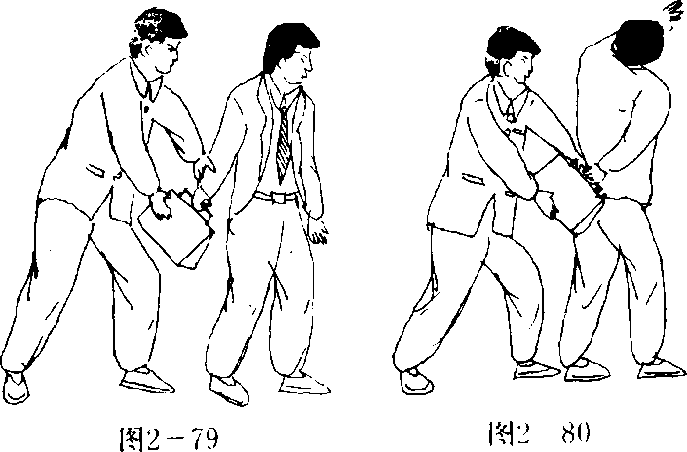 夺包情形:我右手提提包在路上行走;贼由我身后用左手 抓我右腕,右手抓包向下夺(图2 — 79)。