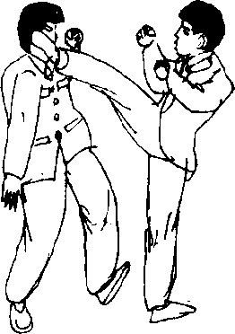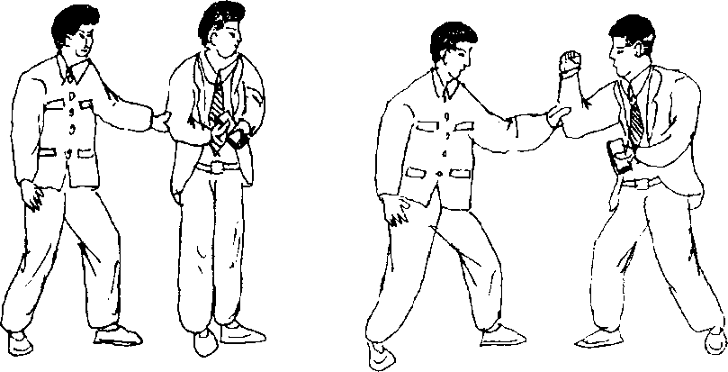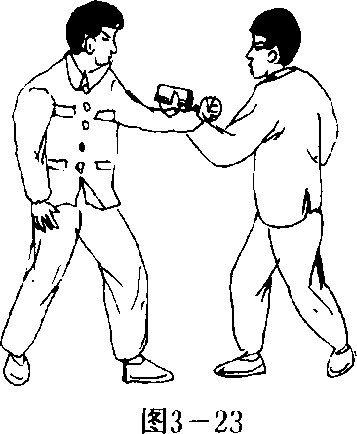 抢钱情形:我买东西,查钱付款时;贼由我身后伸左手抓 住我右臂,欲抢我钱(图3 — 21)。防抢顺序:我身体右后转,同时屈右肘抬小臂(图3- 22)。动作不停,我用持钱左手向上挑贼左腕,趁机右臂抽脱 (图3 — 23)。接上动作,我用左上摆腿踢击贼面(图3—24)。图 3-21图 3-22图 3-24图 3-24图 3-24图 3-24动作要点:转身要快;抬臂及时;挑臂抽脱要一致;摆踢贼 面要快速、准确、有力。