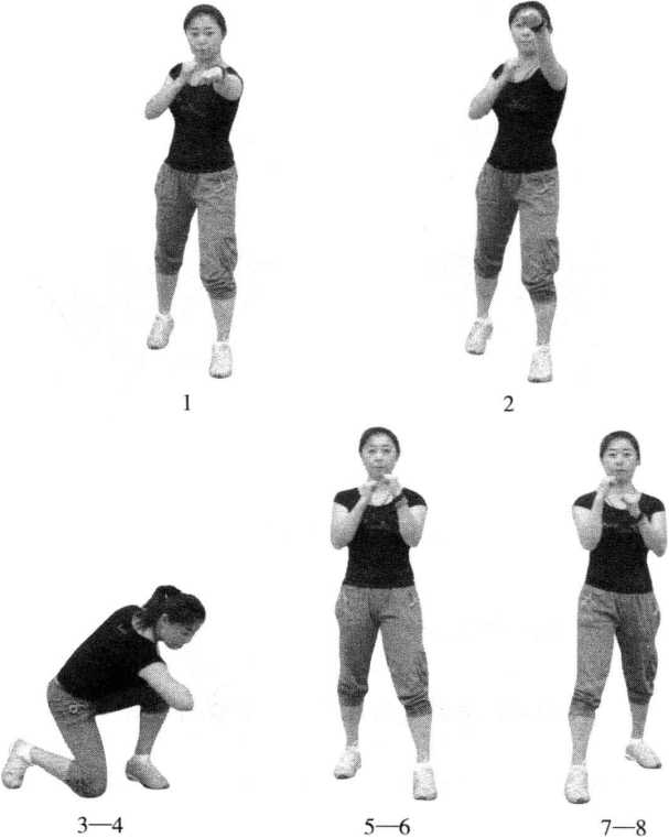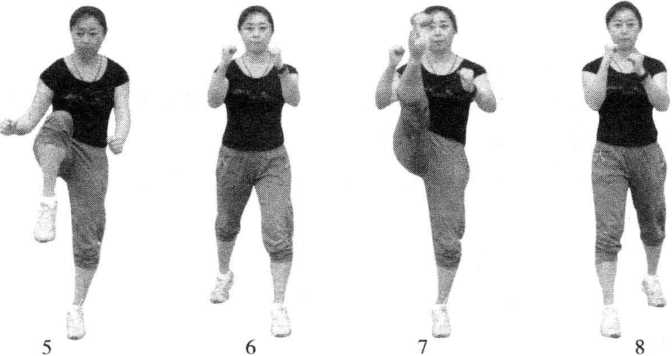 5—6拍提右膝前顶至腰部高度还原双手同时配合下压力量完整