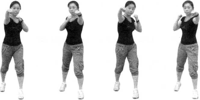 1-2拍右直拳击打对方头面高度接左直拳击打对方头面高度。拳要实拧腰顺肩目视前方劲力完整。