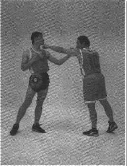 当对手左直拳击我头部时对手的左直拳至少已打出三分之二以上距离我头部先向前迎着左拳然后头和上体迅速向左前作闪躲动作同时我左脚上步用右前臂前伸格挡对手左前臂内侧(图4-1-13)。