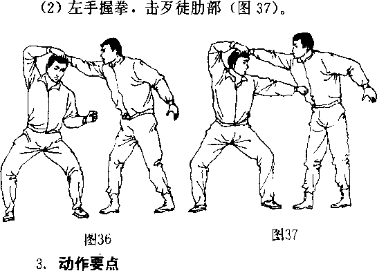 扣握手背牢托击肘有力蹬膝及时左、右手及上下肢配合协调。