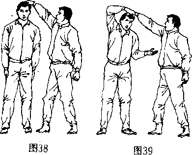 (1)我立即上举右臂用右手扣握住歹徒右手手背(图39)