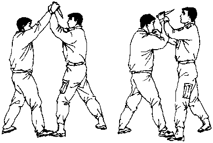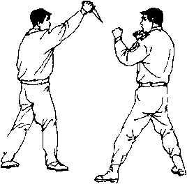敌我双方在格斗中敌在我正前上右步右手正握匕首由上向下刺我头(肩)部(图646)。