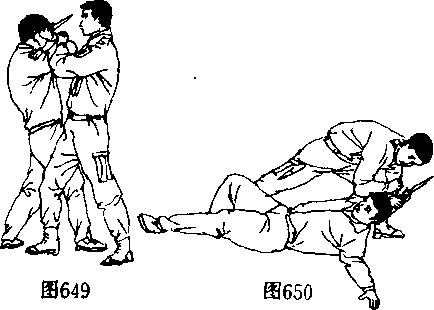 (3)右脚迅速向敌右脚后上步同时右手击小臂由敌右臂穿过右手握住我左手腕左手用力向下压其右手腕同时上体前倾右腿别打敌右小腿使其倒地(图649、650)。