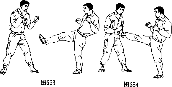 敌我双方在格斗中面对相峙敌抬右腿前蹬我腹部(图653)。