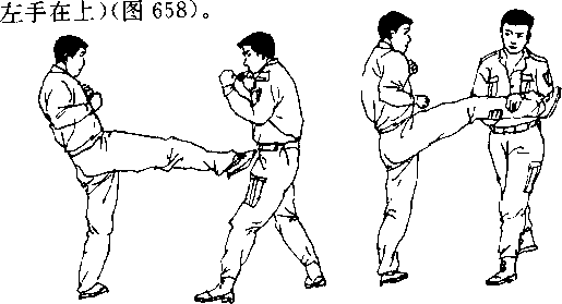 敌我双方在格斗中面对相峙敌起右腿侧弹踢我肋部(图657)