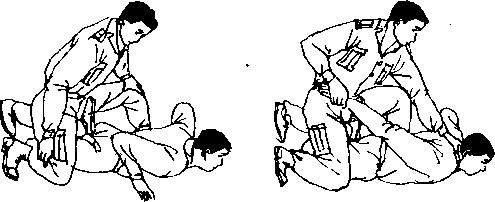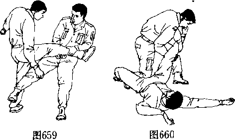 (3)敌倒地同时,我用右腿膝关节部向下跪压敌裆部(图660),将其制服。