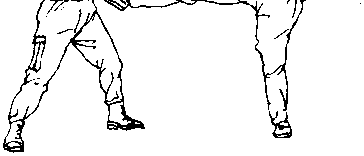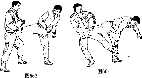 (2)用左小腿向前别绊敌支撑之左小腿(图664),使其倒地。