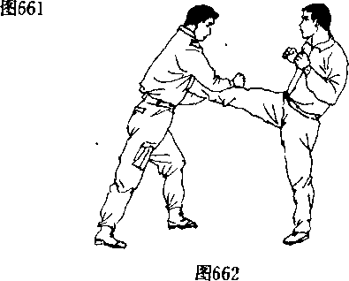 敌我双方在格斗中面对相峙敌起右腿侧弹踢我肋部(图661)。
