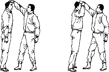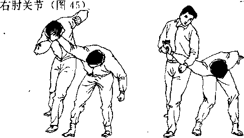 1开始姿势我自然站立或行走歹徒在我正前用右手由上抓住我头发(图42)。2,防卫的动作顺序(1)我立即上举右臂右手扣握住歹徒右手腕(图43)图42 图43(2)右脚向左侧撤步身体右转上体前下倾(图44)(3)右手翻拧歹徒右手腕左臂上举用左小臂下砸歹徒图44图44图45图45图44图44图45图453动作要点扣握腕及时、牢身体转动协调砸肘有力。