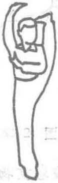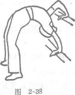 6 下腰背对肋木或墙壁双腿直立仰头、挺胸、顶虢,用双手向后支撑支撑体继续顶髓下腰双手交替扶着支撑体下行,直到自己腰部能承受后弯的最大限度,再交替上行至恢复立正姿势(图2-38)。图2-39图2-39