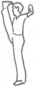8 侧跖腿预备势与正踢腿同右脚向前上一小步脚尖外展左脚跟稍提起身体略右转左臂前举右臂后伸随即左脚脚尖勾紧向右耳侧踢起。同时右臂屈肘上举亮掌左臂屈肘立掌于右肩前或垂于裆前眼向前平视(图2-40,图2-41)
