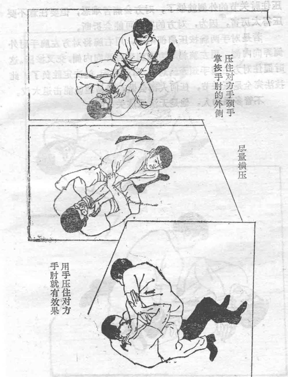若是对手两腕按压肩部附近9用右腕将对方左腕手肘外侧弄向内侧用左腕将对方右腕手肘弄向内侧交叉按压。这时握住对方右腕手颈弄倒对方自己爬起就决定胜负了。此技法完全是压关节任何人都会做轻易地就能击退大汉。