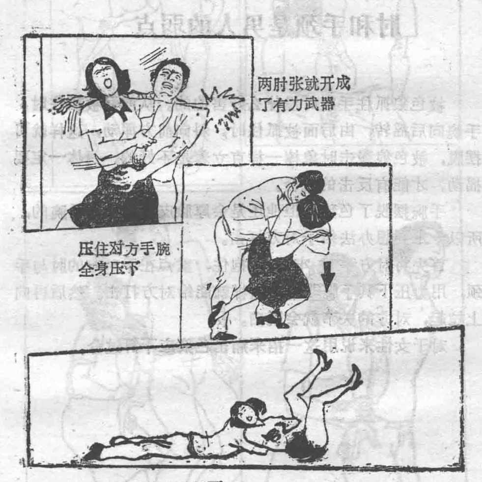 色狼以从后抱住为最多如果你拼命的挥动手脚即可弄开对方手腕如做得好还可用手腕打中对方的脸即可趁机逃走。要诀在于两手重叠肘部张开来挥动肘部力量是很大的若能打到对方就能给予对方极大的打击。