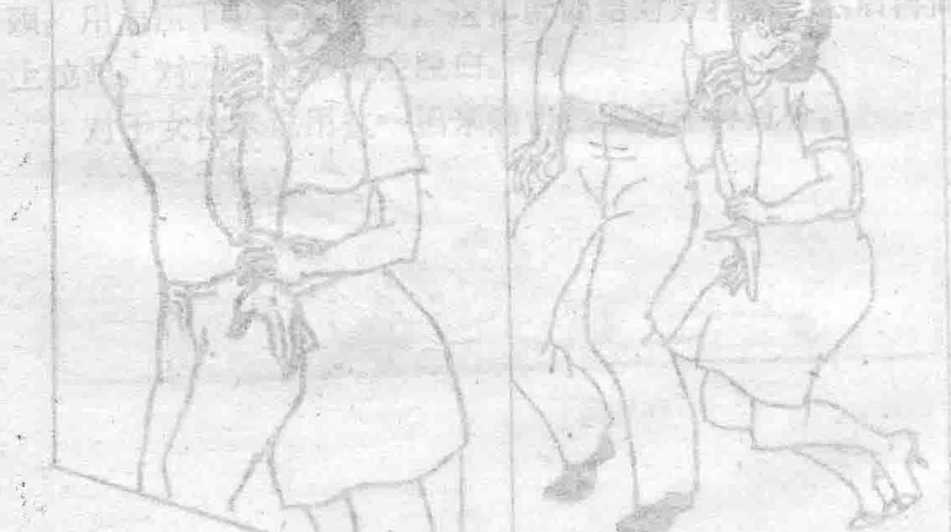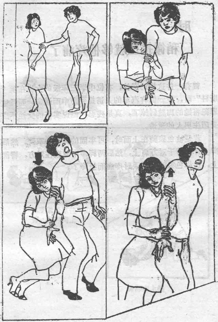 另一方法是女性被人从后面抱住时用手压住对方两腕加上全身重量而吊于对方手上女人的体重也有四、五十公斤左右男性的手腕是肯定承受不了的这样就可摆脱危险趁机逃走。
