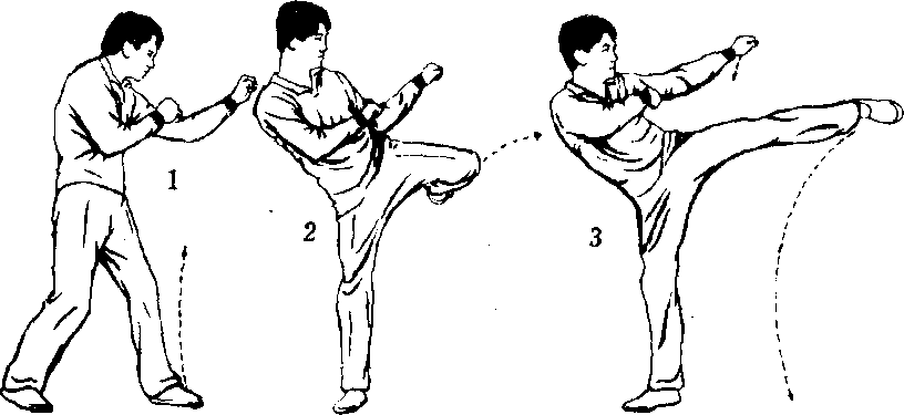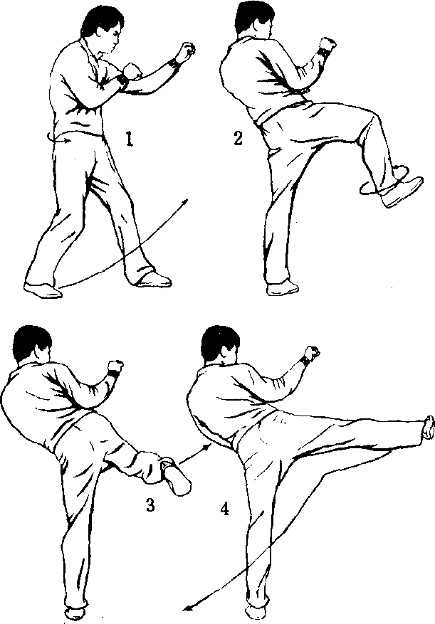 左格斗式(图697)。上体稍右转,身体重心稍后移, 左腿屈膝抬平,膝内转,膝尖向右,脚尖绷直(图69-2)。 上肢姿势不变,随即左脚由左侧向右前方弹击,同时呼气发 力,力达脚背,眼视攻击方向(图48-3)。随后左脚向前落 步还原成左格斗式,