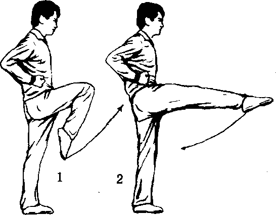 变(图68T)。随即右脚由下向正前上方弹击,同时呼气发 力,力达脚背,眼视前方(图68-2)。随后右脚落步,还原