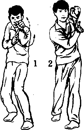 左格斗式(图 右拳变虎形掌, 由左胸前至右侧搂抓,同时 身体向右转体拉臂,掌心向 外,力达五指及掌心,眼视 前方(图110-2)